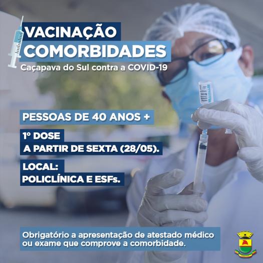 A Secretaria de Saúde de Caçapava do Sul informa que a partir desta sexta, dia 28 de maio, começa a vacinação exclusiva para pessoas que têm comorbidades a partir de 40 anos. As doses serão aplicadas nas pessoas com comorbidades atendidas conforme a região de atendimento da policlínica e ESFs.