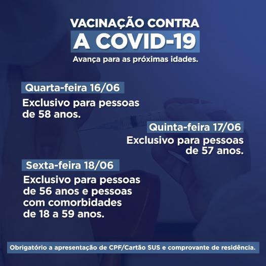 A vacinação será exclusiva nos dias 14/06 e 15/06 para pessoas de 59 anos e nos dias 16/06 e 17/06 será exclusiva para pessoas de 58 anos. Dia 18/06 será exclusivo para pessoas com comorbidades de 18 a 59 anos que ainda não se vacinaram com a primeira dose. Pessoas de 18 anos ou mais com comorbidade, devem apresentar atestado médico ou exame confirmando a doença.