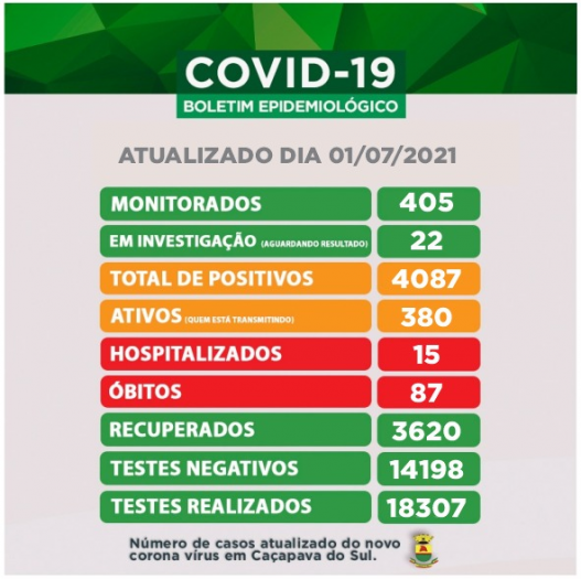 Nesta Quinta-feira, 01 de julho, Caçapava do Sul, registra 380 pacientes Ativos com a Covid-19. Isso representa -70 pessoas com a doença desde o último informe.