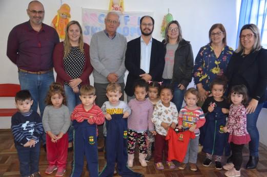 O Prefeito Giovani Amestoy, juntamente com o Secretário Municipal de Educação, Aristides Costa, a Secretaria Geral, Cassia Freitas e seu adjunto, Joel Ribeiro, além da equipe da Seduc participaram da entrega dos uniformes.