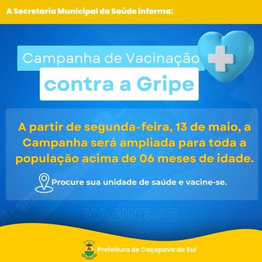partir de 13/05/24 a Campanha de vacinação contra a Influenza está ampliada para toda a população acima de 06 meses de idade, conforme recomendação do Ministério da Saúde.