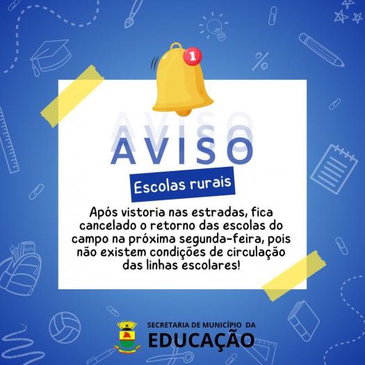 as equipes da secretaria de obras seguem trabalhando para viabilizar o tráfego das estradas do interior, com isso, as aulas permanecem suspensas nas Escolas Rurais até uma nova vistoria no roteiro do transporte escolar,