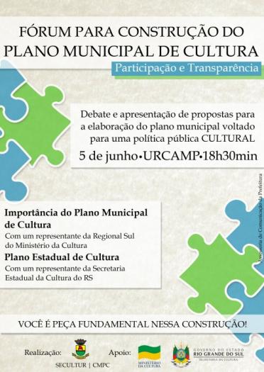 Na próxima quarta-feira, dia 5, acontece no salão de atos da Urcamp, às 18h30min, o Fórum para Construção do Plano Municipal de Cultura.