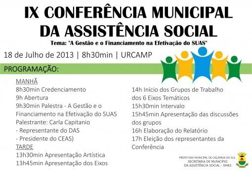 A Secretaria de Assistência Social confirmou a programação para a IX Conferência Municipal de Assistência Social que acontecerá no dia 18 de julho, no salão de atos da Urcamp.