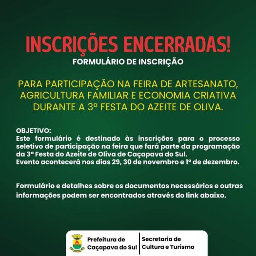 A Prefeitura de Caçapava do Sul, através da Secretaria de Cultura e Turismo, em Parceria com a UFSM e Unipampa pelo Geoparque Caçapava, informa que inscrições para credenciamento para feirantes (artesanato e agricultura)