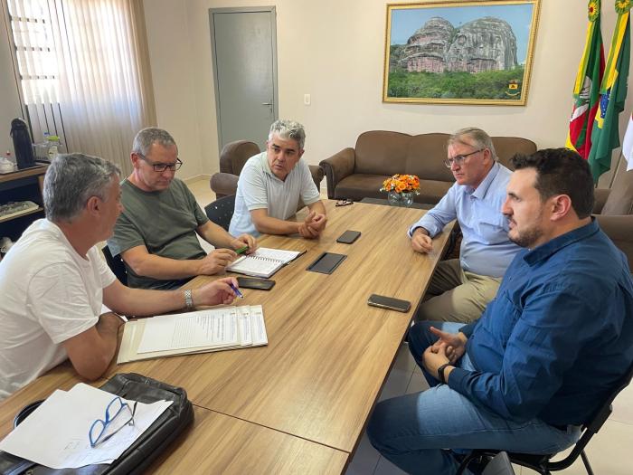 com o prefeito Marcelo Spode, Secretário de Gestão, Desenvolvimento e Governança, Dilvane Loreto, Secretário de Agropecuária, Marquinho Vivian, o servidor Marcelo Cunha e o vereador Paulo Pereira.
