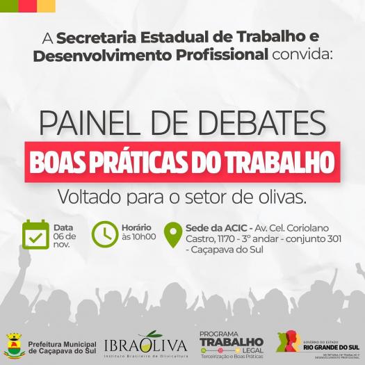 Evento imperdível na agenda da Prefeitura de Caçapava do Sul! A Secretaria Estadual do Trabalho e Desenvolvimento Profissional traz para a nossa cidade o 'Painel de Debates: Boas Práticas do Trabalho' voltado para o setor de olivas