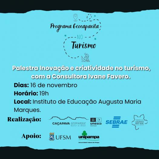 Na próxima quinta-feira, 16/11, às 19 horas no Instituto Municipal de Educação ocorre a palestra “Inovação e Criatividade no Turismo”, com a Consultora Ivane Favero.